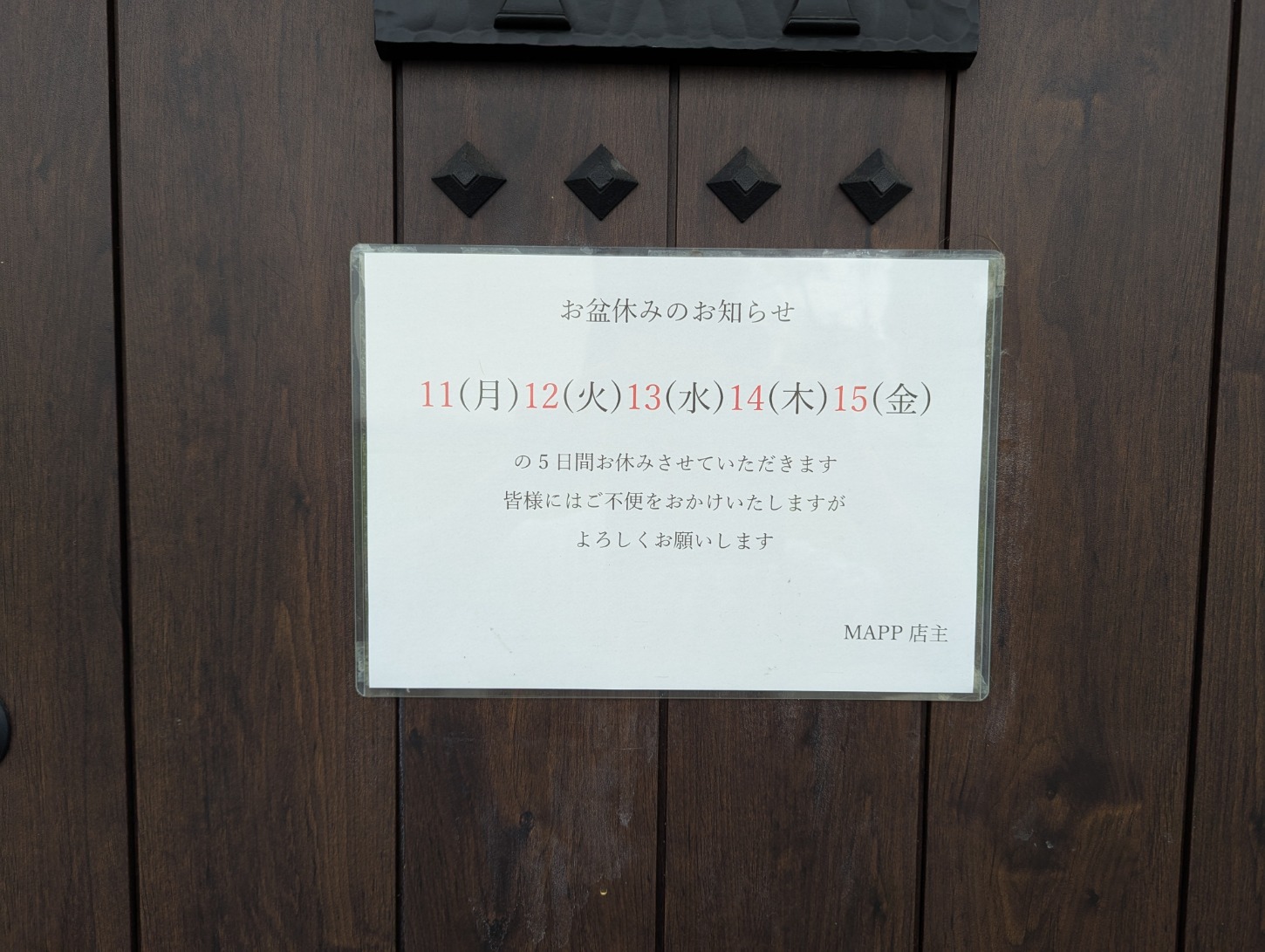 お盆休みのお知らせ 2025年8月11日(月曜日)~15日(金曜日)の5日間 お盆休みとさせていただきます。 皆様方にはご不便をおかけいたしますが、よろしくお願いします。 【飾磨駅徒歩10分】【姫路バイパス南ICから車で3分】 〒672-8045 姫路市飾磨区中野田2丁目41-1 ■営業時間 9:00~18:00(カット最終18:00までのご来店) ■定休日…月曜・火曜 ■専用駐車場あります