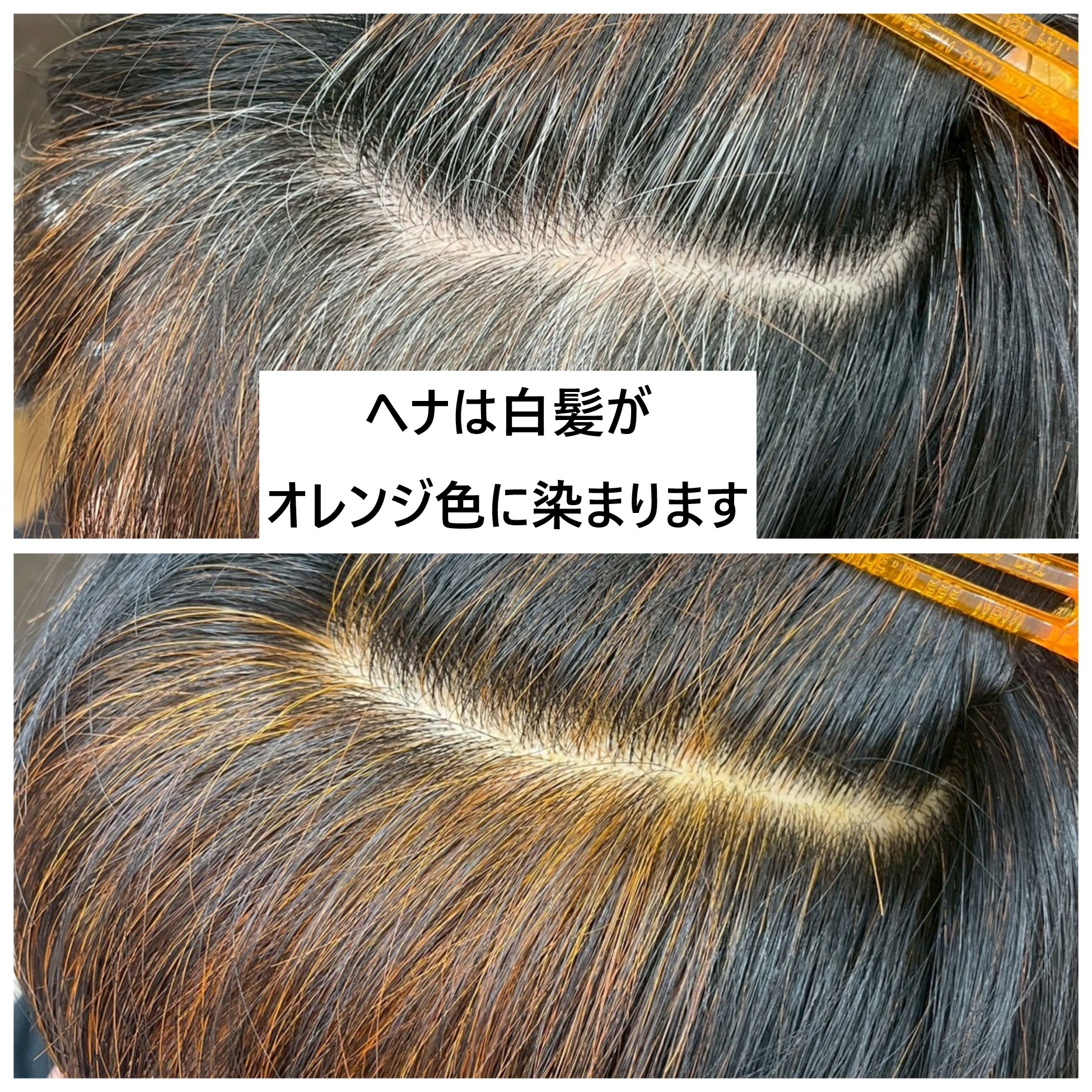 ヘナは白髪をオレンジ色に染めるので、白髪率が40%を超えると少し奇抜な印象になり色味調整が必要になったりもします。
